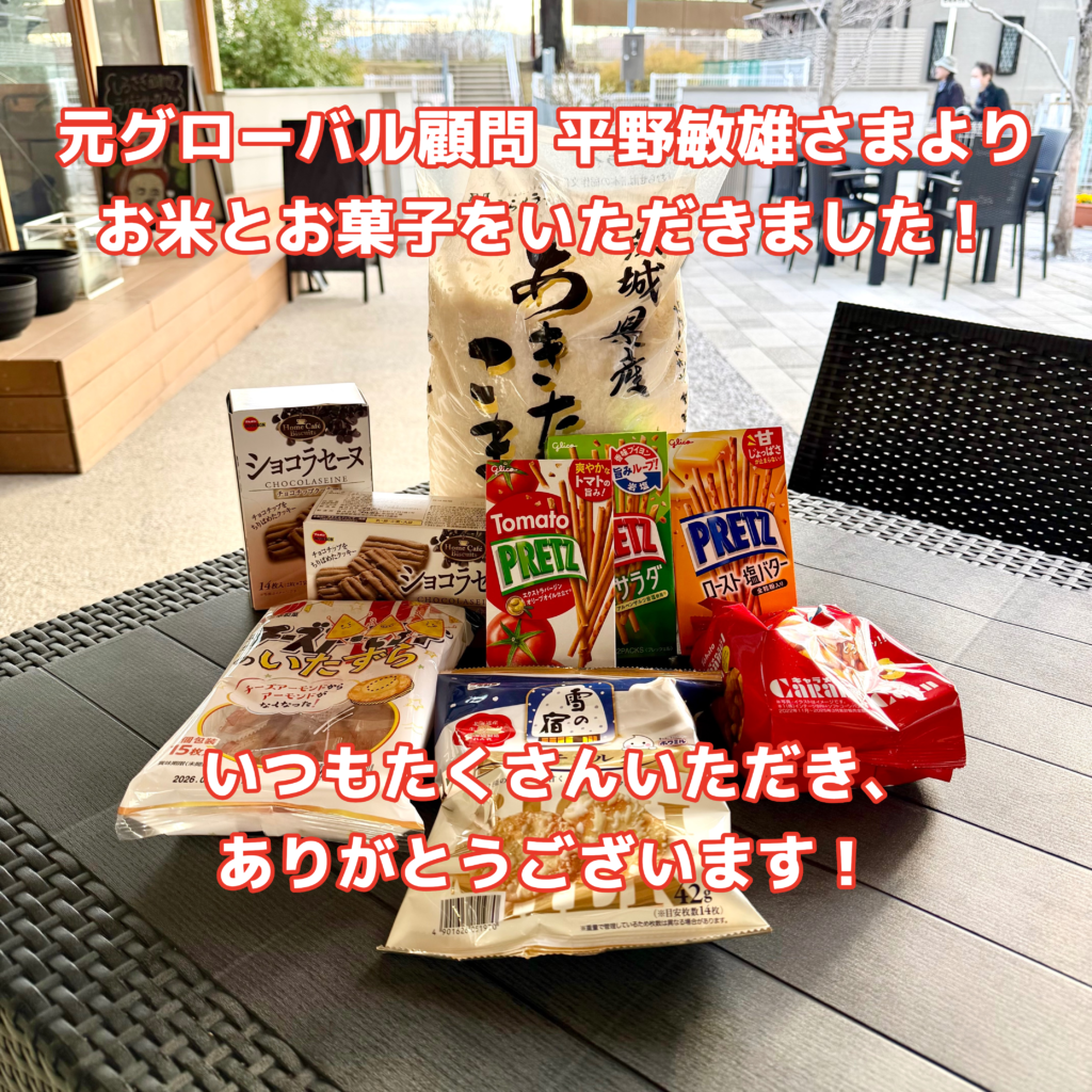 元グローバル顧問の平野敏雄さま 2026年1月6日 最終更新日時 : 2026年1月15日 captain 元グローバル顧問の平野敏雄さまより、お米とお菓子をいただきました✨いつもありがとうございます!お米は友だち食堂で提供させていただきます🍚お菓子はハッピーコインと交換です🍭物価高騰のなか、大変助かります😅ありがとうございました✨