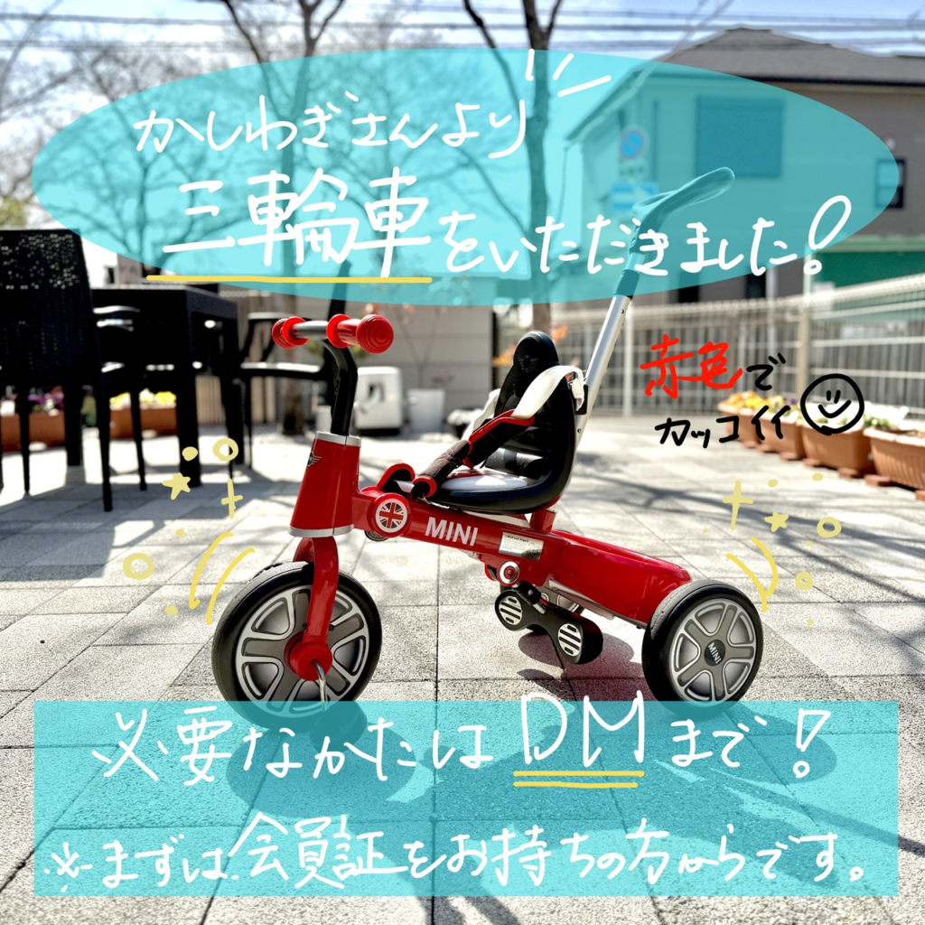 2/25(水)12時以降より、インスタグラムのアカウントまで、会員番号と合わせて「三輪車希望」とDMでお送りください。