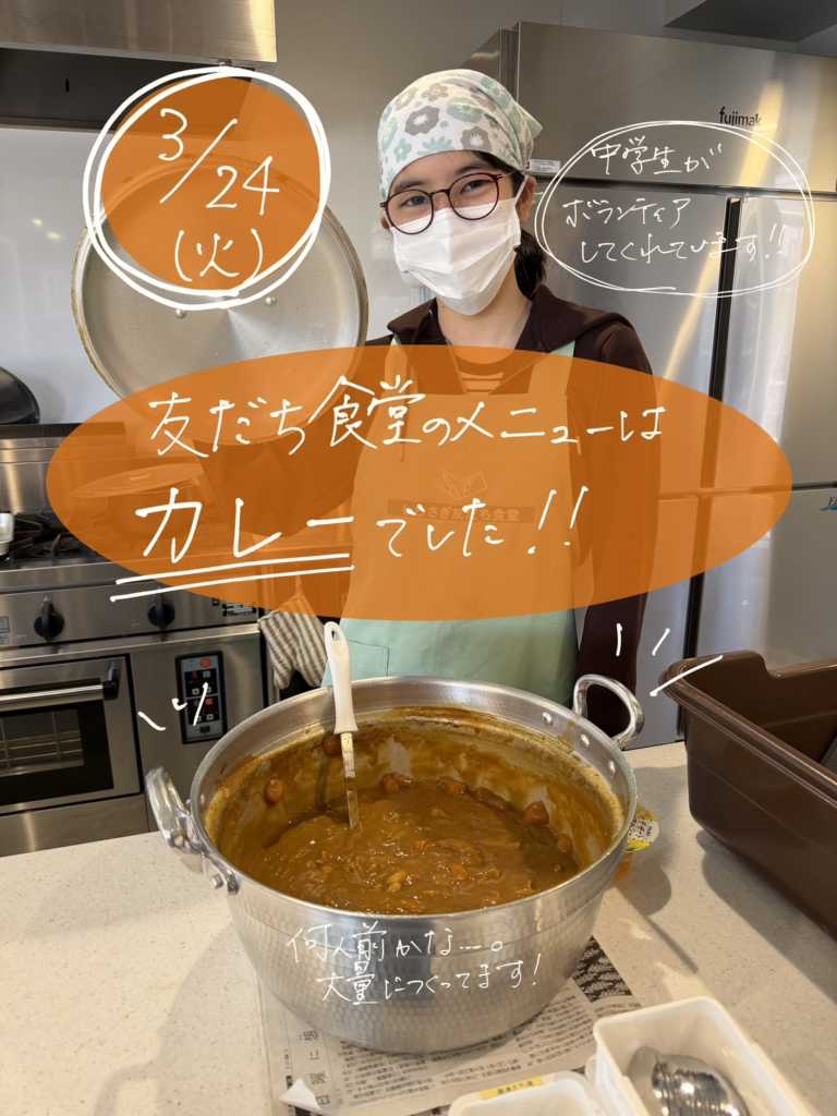 3/24(火) 友だち食堂初日でした! 2026年3月25日 最終更新日時 : 2026年3月25日 captain 3/24(火)では、多くが小中学校が修了式の日でした!メニューはカレーで、たくさんのおかわりがでました。中学生のボランティアも大活躍してくれています!これからもよろしくお願いいたします。