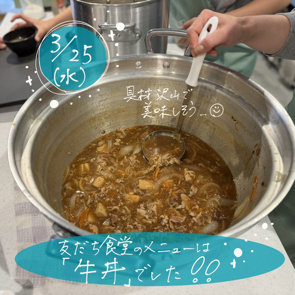 3/25(水) 友だち食堂でした! 2026年3月25日 最終更新日時 : 2026年3月25日 captain 3/25(水)友だち食堂のメニューは牛丼でした!甘い玉ねぎがたくさんです。今日はお昼ごろから雨でしたね,,,,まだまだ寒い体にしみわたりますね🤤