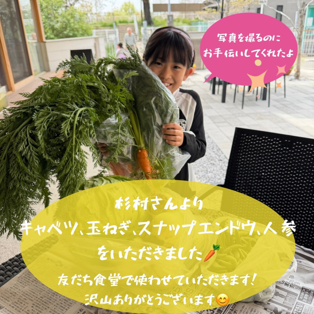 杉村さんより、お野菜のご寄付をいただきました 2026年4月14日 最終更新日時 : 2026年4月14日 captain キャベツ・スナップエンドウ・玉ねぎ・にんじんをいただきました🌟いつも、新鮮なお野菜をたくさんご寄付いただき、感謝しております!ありがとうございます!