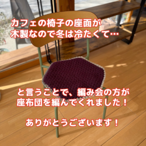 カフェの椅子の座面が木製のため、編み会の方が編んでくれました!これで冬は暖かい🌟やすださん、ありがとうございます!2枚目、3枚目もよろしくお願いいたします!!